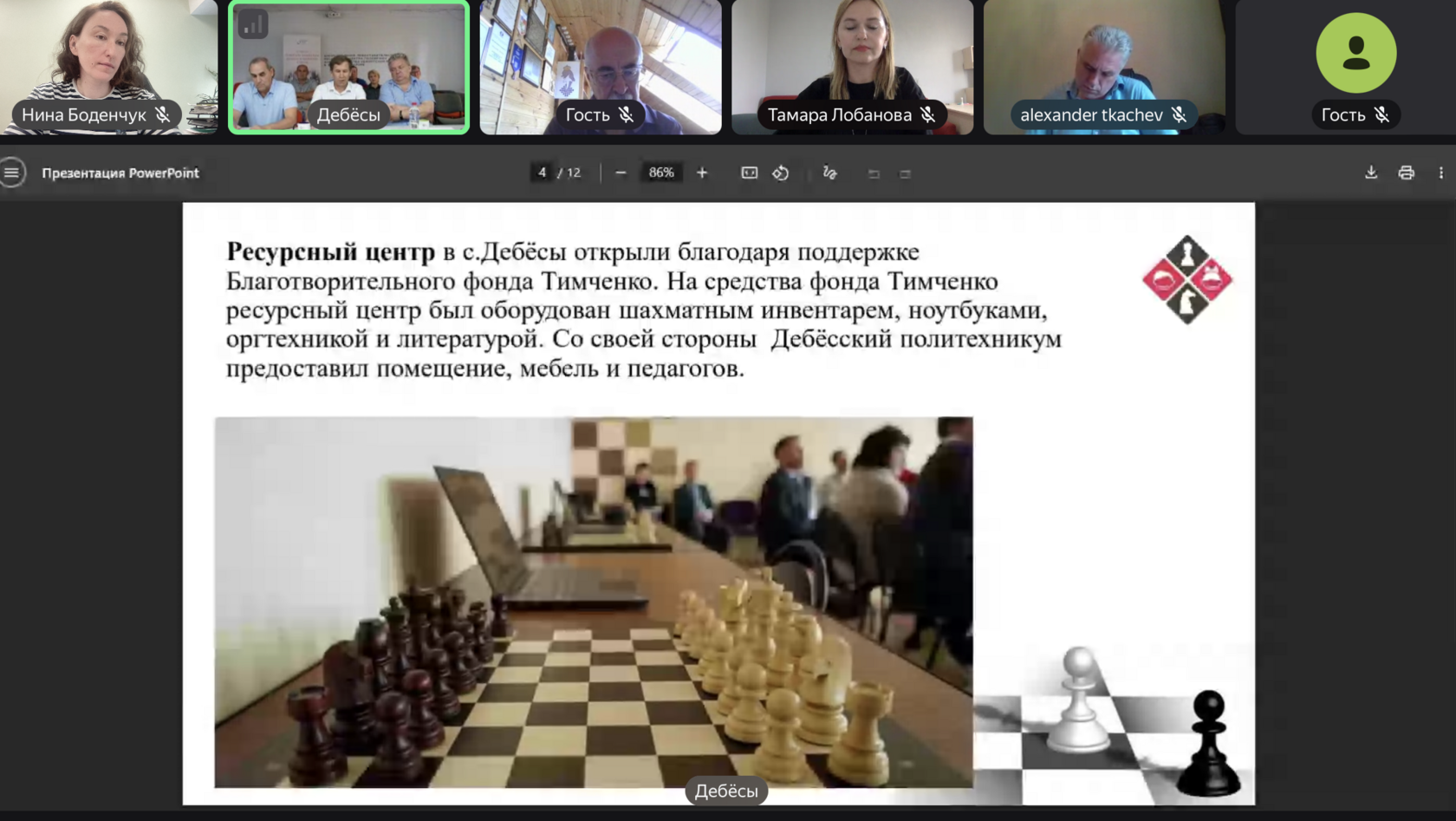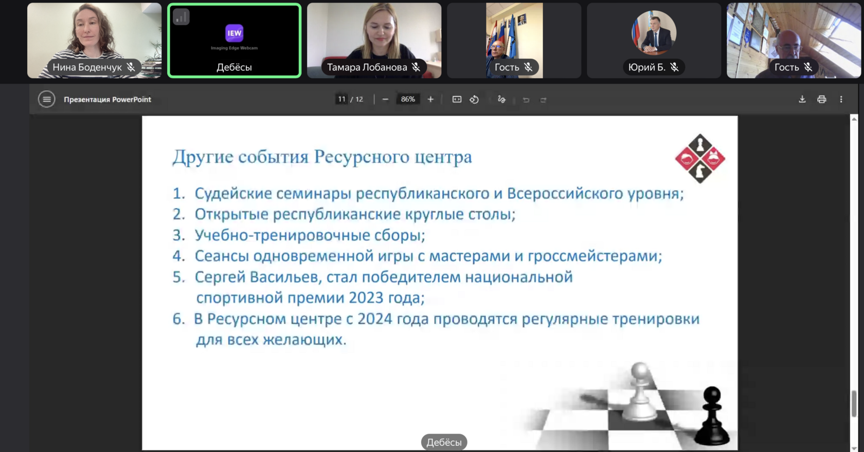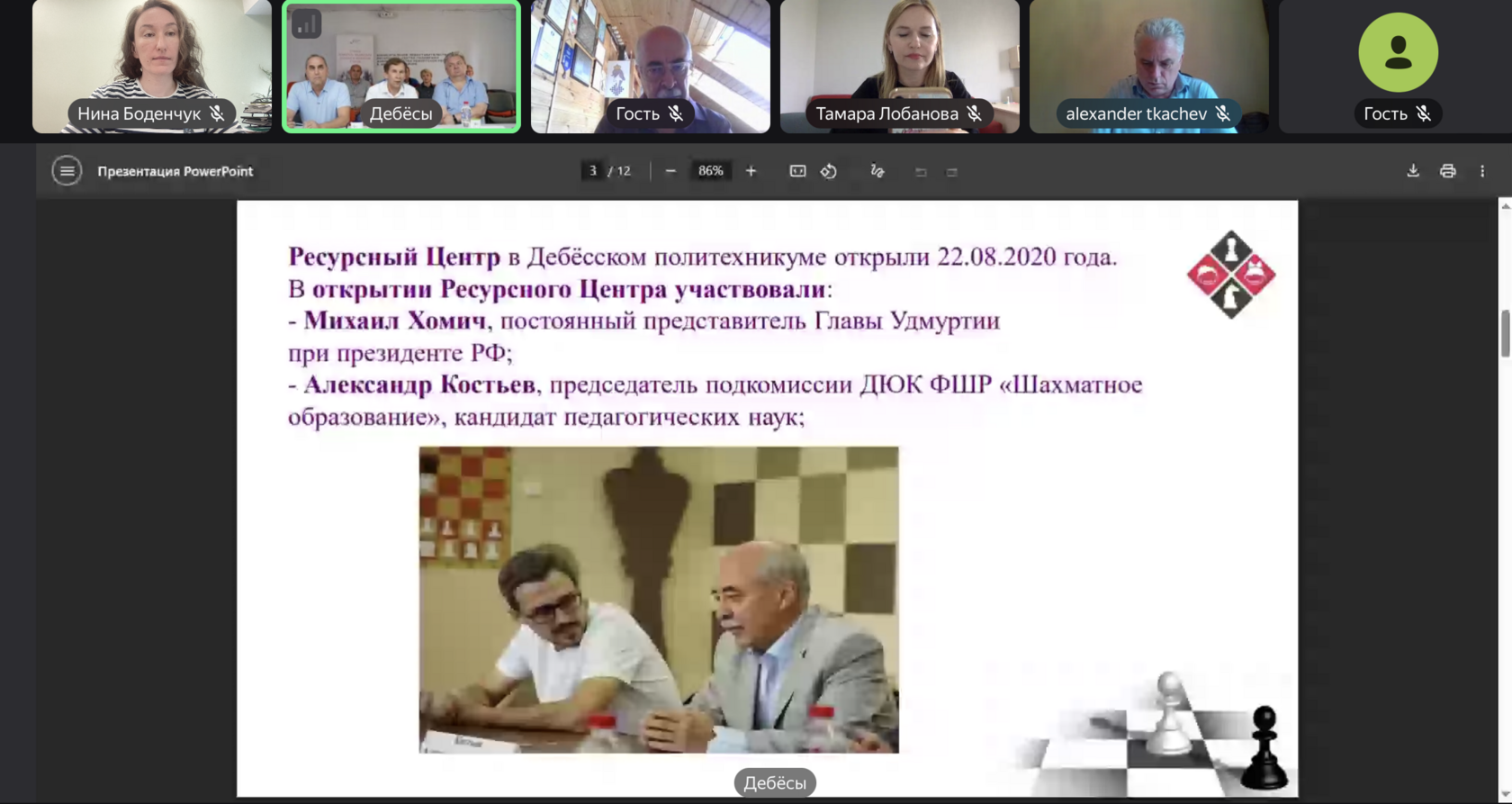 25 июля на базе Ресурсного центра по шахматам Дебесского политехникума (село Дебесы Удмуртской Республики) прошла Всероссийская онлайн-конференция «Ресурсный центр – возможности, результаты и перспектива». Участие в ней приняли представители региональных ресурсных центров по шахматам, педагоги и тренеры, реализующие программу «Шахматы в школах», а также представители Всероссийского шахматного фестиваля «Ход конем на Сибирском тракте».