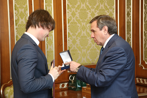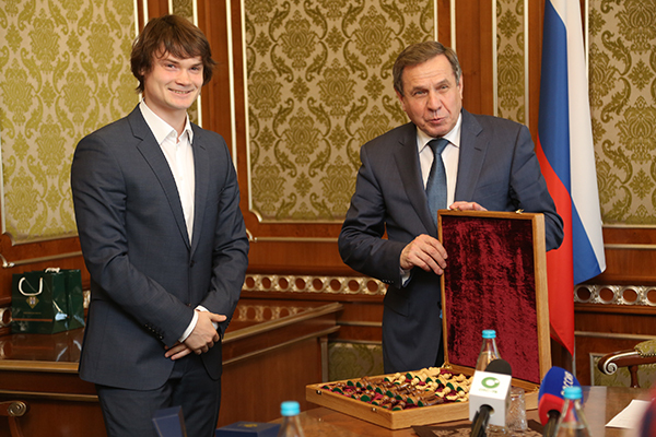 От имени Российской шахматной федерации в знак признательности за оказанную поддержку губернатору было вручено благодарственное письмо, а от областной Федерации - шахматы.