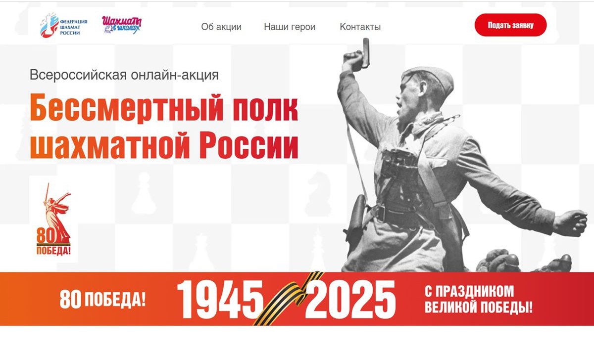 Всероссийская онлайн-акция «Бессмертный полк шахматной России» проводится Федерацией шахмат России в рамках специального проекта «Страна помогала шахматам, шахматы помогали стране». Одна из важнейших целей акции, в которой приглашаются принять участие все желающие шахматисты, — сохранение исторической памяти о ветеранах и участниках Великой Отечественной войны, а также укрепление духовной связи между людьми разных поколений.