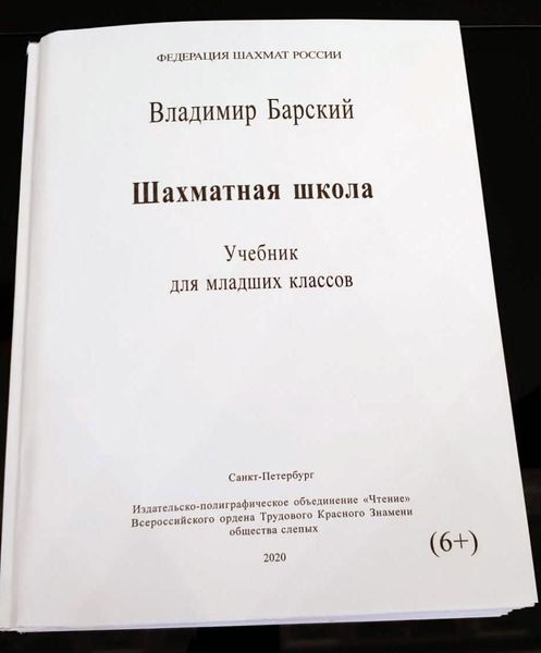 Федерация шахмат России с помощью издательско-полиграфического объединения "Чтение" Всероссийского общества слепых выпустила учебник для начинающих "Шахматная школа" (автор - В. Барский) со шрифтом Брайля, который используют для чтения слепые и слабовидящие люди. Свыше 650 учебников безвозмездно переданы в региональные учреждения ВОС (школы, библиотеки и т.п.), и еще 100 экземпляров были вручены сегодня генеральному директору Культурно-спортивного реабилитационного комплекса ВОС Владимиру Баженову для дальнейшего распространения.
