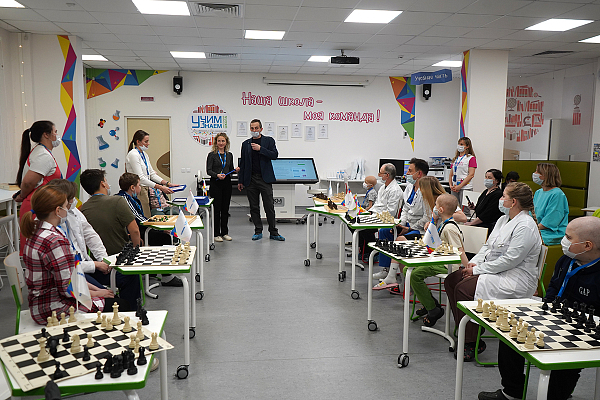Перед началом сеанса ребят поприветствовали руководитель методического объединения педагогов дополнительного образования школы "УчимЗнаем" Кристина Дрига, Александр Грищук и главный тренер сборных команд России по шахматам гроссмейстер Сергей Яновский.